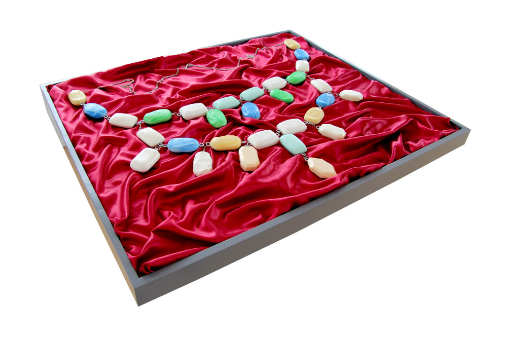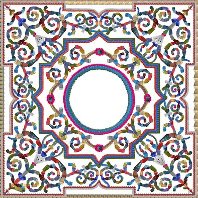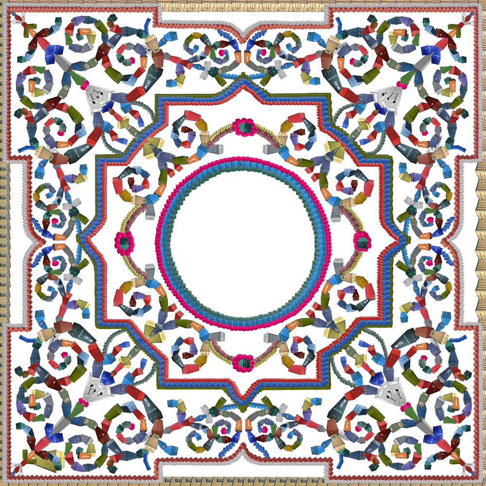 In einer weiteren Arbeit transformiert er das Deckendekor des Saales zu einem orientalischen Ornament. Auf den ersten Blick glauben wir eine Rosettenform aus bunten Legosteinchen zu sehen, deren Einzelteile sich dann bei näherer Betrachtung als aneinander montierte Container herausstellen. Zirkulierende Warenströme in normierten Boxen als Sinnbild unserer vernetzten Welt. Das barocke Stilelement der Bewegung findet hier seinen Ausdruck in modernen Formen der Technik.