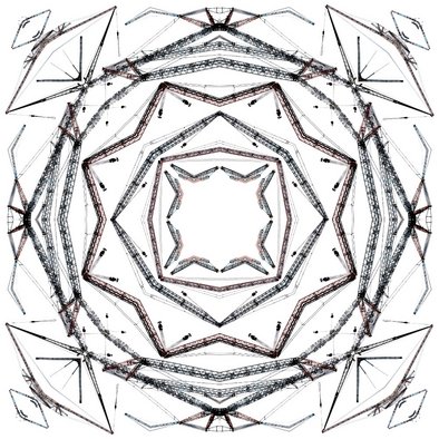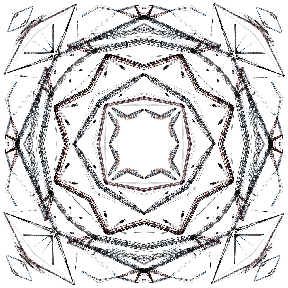 So verwandelt er in der Ehinger Ausstellung die dekorativen Elemente der Stuckdecke des Speth’schen Hofs mittels einer Fotomontage in eine technoide Mandalaform, deren Einzelelemente aus Auslegerarmen und Seilzügen von Gittermastkranen gebildet werden, die er auf dem Gelände der Fa. Liebherr fotografiert hat.