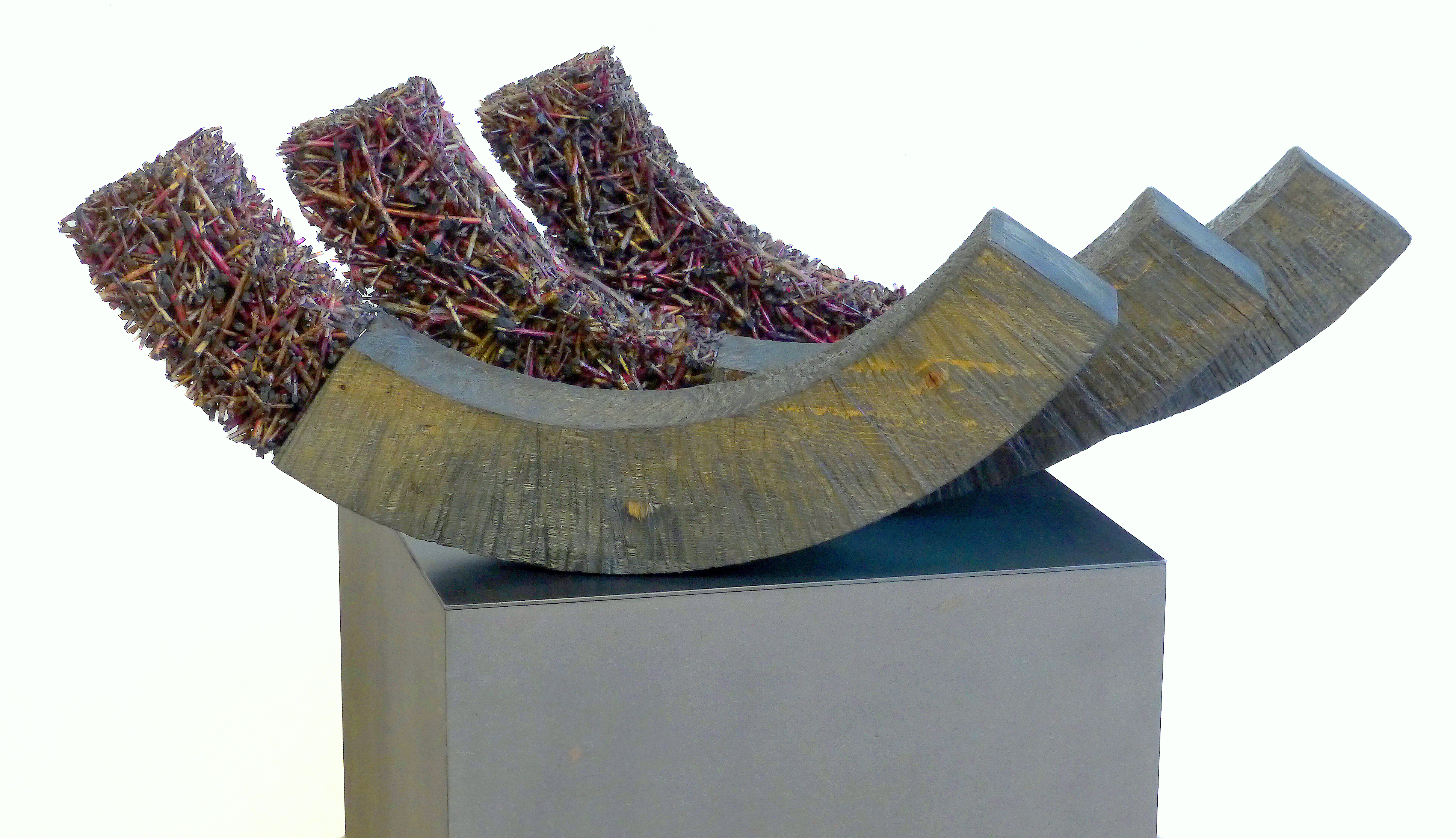 Auf seine Arbeiten trifft das künstlerische Motto von Paul Cezanne zu: „Kunst ist eine Harmonie parallel zur Natur.“ Das will erarbeitet sein. Im Atelier gibt es ein riesiges Lager von Zweigen mit vielen Verästelungen, geordnet nach Formen, Stärken und Farbtönen, die seinen Skulpturen ihren lebendigen inneren Rhythmus und sensible Schönheit verleihen. Beim Schichten müssen auch bereits die späteren Schnittkanten geplant werden, die ein eigenes ästhetisches Muster an den Außenflächen bilden. Diese kleinteilige Lebendigkeit steht im Kontrast zu den großen geometrischen Grundformen, für die bereits im Anfangsstadium passende Sockel als eigenständiges Element der späteren Skulptur hergestellt werden. In konsequenter Arbeit hat Norbert Klaus seine meditative Kunst immer mehr verfeinert und perfektioniert.