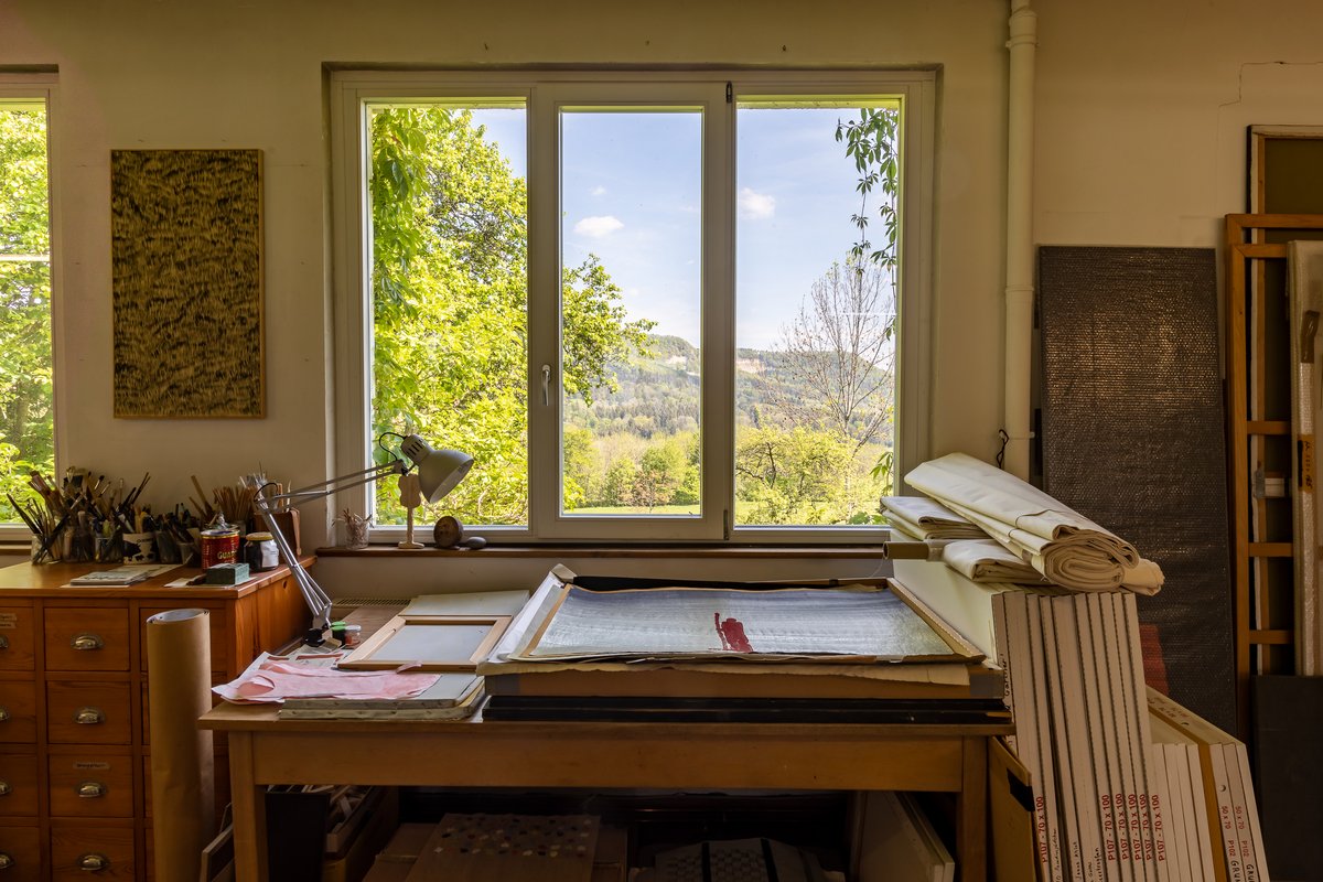 Die Ausstellung KUNSTSPHÄRE ALB, die im Rahmen des inter!m Festivals stattfindet, ist eine Koproduktion des Museums Villa Rot und der Städtischen Galerie Ehingen. Sie macht am Beispiel von 14 ausgewählten künstlerischen Positionen deutlich, dass die Schwäbische Alb nicht nur ein Biosphärengebiet, sondern auch eine regelrechte Kunstsphäre ist. In den Räumen der Städtischen Galerie Ehingen treffen großformatige bildhauerische Arbeiten auf zarte Radierungen, abstrakte Ölgemälde auf Objekte aus Holz und Wachs. Das Kooperationsprojekt des Museums Villa Rot und der Städtischen Galerie Ehingen hat sich zur Aufgabe gemacht, die Vielfalt und die Qualität bildnerischen Schaffens auf der Alb in den Fokus zu rücken. Dadurch soll sichtbar werden, dass gute Kunst auch fernab der großen Metropolen dieser Welt entsteht. Doch die Ausstellung versteht sich nicht nur als reine Werkpräsentation. Sie möchte auch die Lebens- und Arbeitsbedingungen der teilnehmenden Künstler porträtieren und danach fragen, was es für sie bedeutet, fernab der großen Kunstzentren zu leben und zu arbeiten. Was sind die Vor- und Nachteile ländlicher Infrastrukturen und wie beeinflussen diese die künstlerische Arbeit? Was könnte getan werden, um das krea- tive Potenzial in der Region zu fördern? Das sind Themen, welche sich hinsichtlich des ländlichen Raums in Zeiten des demografischen Wandels in drastischer Weise stellen. In der Ausstellung sind Antworten der ausstellenden Künstler auf diese und andere Fra-gen zu lesen. Gerahmt werden die Interviews von Fotografien Herbert Geigers, der die Ateliers und Arbeitsorte der teilnehmenden Kunstschaffenden porträtierte. Das Ergebnis ist ein vielfältiger und spannender Auszug aus der Kunstproduktion im ländlichen Raum am Fallbeispiel der Schwäbischen Alb.